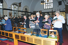 On Sunday 23rd October we gathered at St George's Memorial Church for the Dedication of the Prewett Window. Alan Regin, who was responsible for the installation of the new ringing bells — see above — organised for the design and installation of the Prewett Window in the ringing loft.