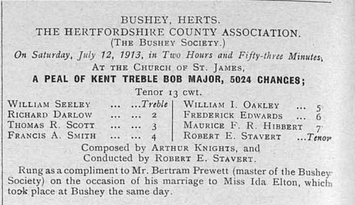 ‘The death of Mr Bertram Prewett is a great loss to Bushey and the ringingworld in general. Born in Hampstead, he was brought as an infant to Bushey. He was educated at Watford Grammar School, at 16 years he won a place in the Civil Service. Mr Prewett began ringing at St Matthew’s Church at the early age of16. He rang nearly a thousand peals, two hundred and thirty six of which he himself conducted. He rang all over England and Ireland, in thirty seven counties, and in two hundred and forty towers. He was a member of the following associations – College Youths, Middlesex, Kent, Hertfordshire, Sussex and Midland counties. No one hated fighting more, but at an early date of the warhe offered himself and joined the Rifle Brigade. He was wounded in the German offensive on 23 March 1918. When in hospital at Etaples, his ward was heavily bombed and all its occupants killed. He had just gone out to help theorderlies. We offer our sincere sympathy to his aged father and mother, who live in Bushey Grove Road, and to his wife."